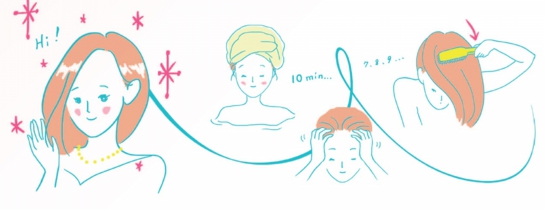 - 温めたタオルを巻いてその上からシャワーキャップをかぶり、10分程置いたらシャンプーで洗い流しましょう。