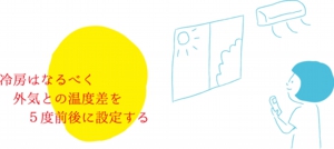 - ・冷房は、なるべく外気との温度差を5度前後に設定する。