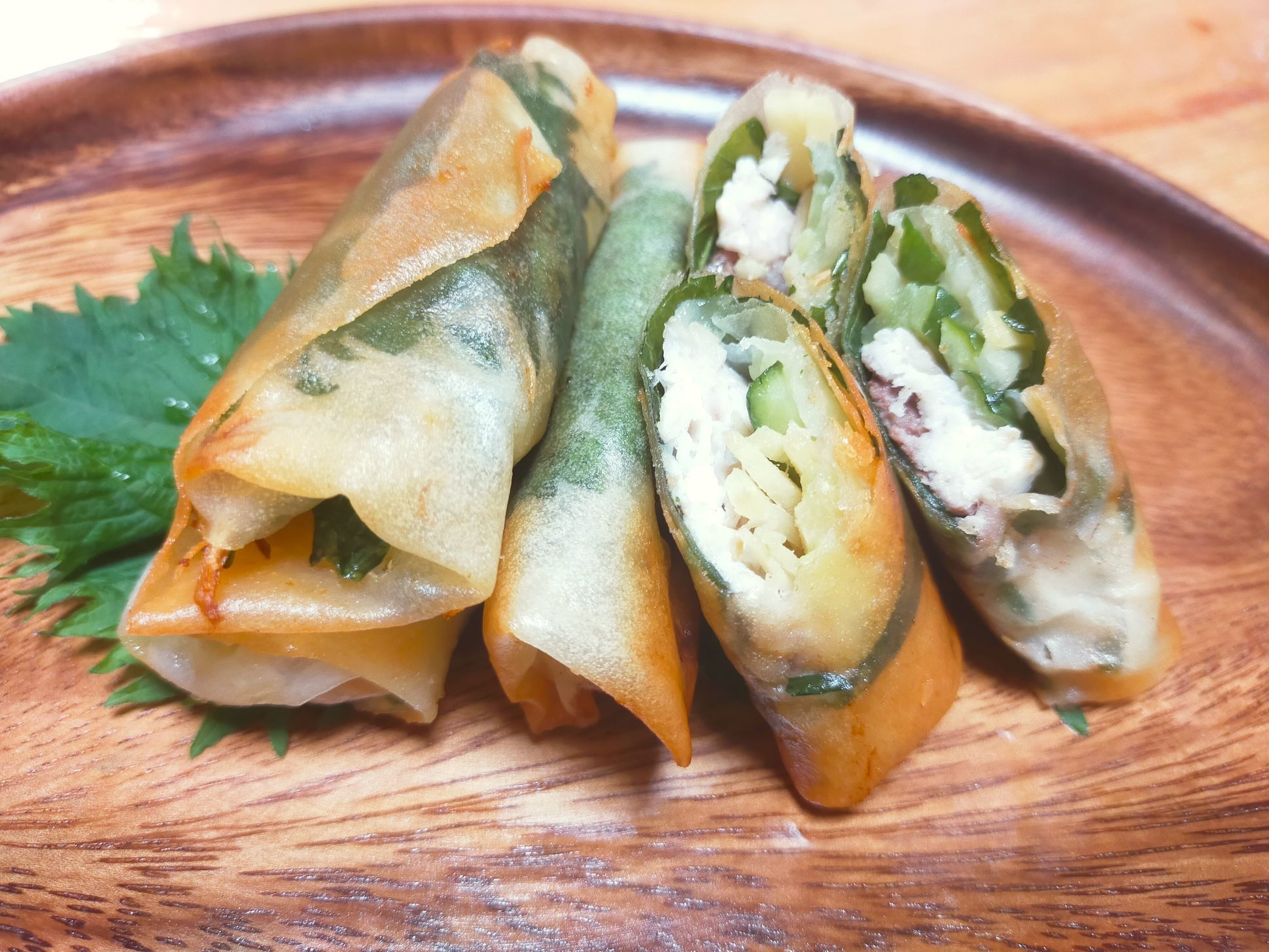 3.紫蘇は揚げた時に紫蘇が映し出されるように置き、左右の角をたたみ巻いていくと出来上がりがとても綺麗になります。