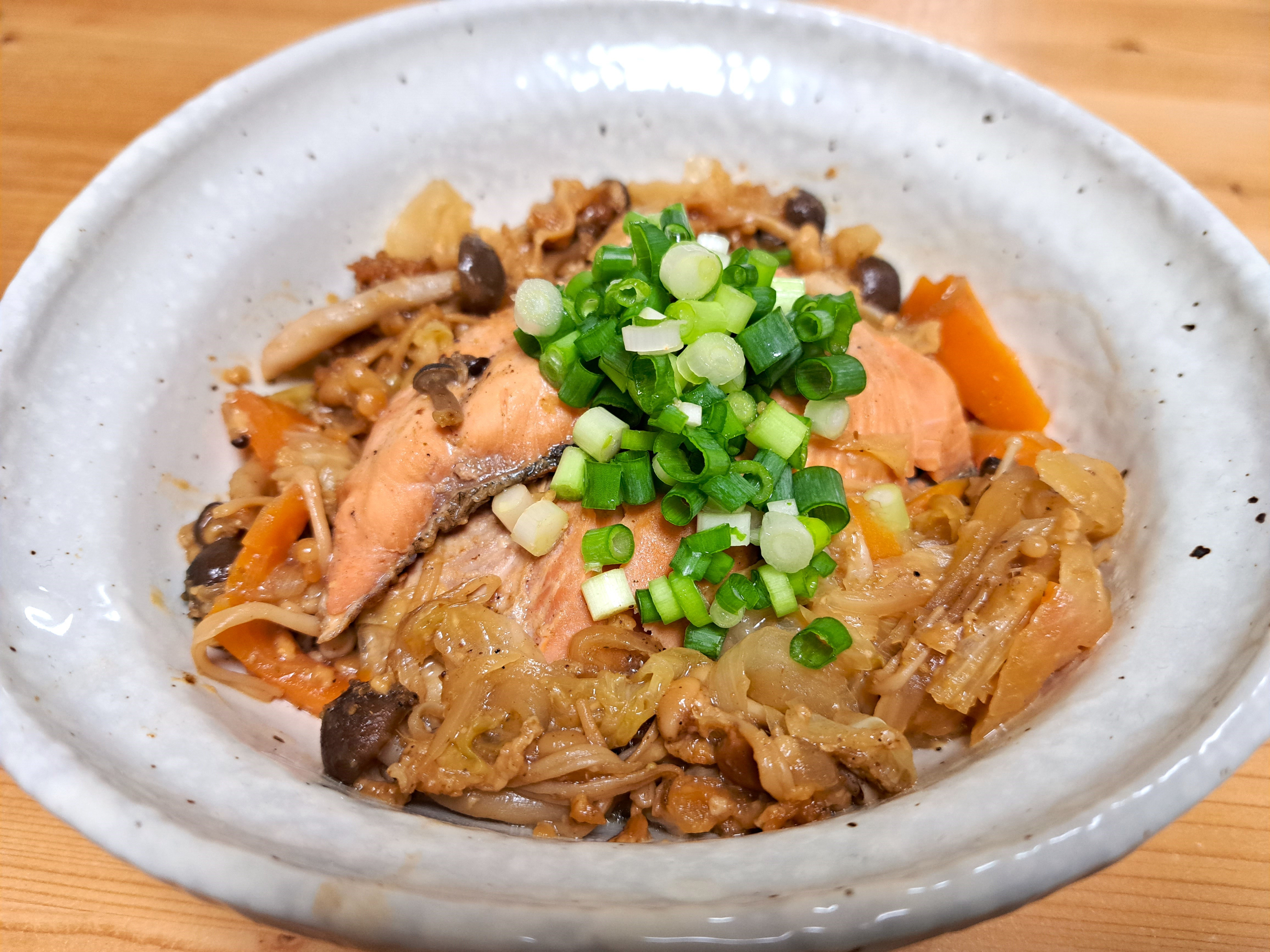 3.フライパン(ホットプレートでも)を熱し、バターを半量入れて鮭を両面焼く。鮭の周りに野菜を加え、混ぜ合わせたAを回しかけ、残りのバターを乗せて蓋をして蒸し焼きにする。