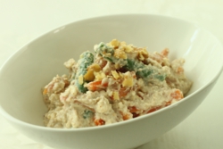 - ミックスナッツを細かくなるまでフードプロセッサーにかけ、豆腐、調味料を加えて混ぜ合わせる。