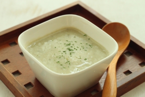 - ④のあら熱をとり、ミキサーにかけ、豆乳(牛乳)でとろみの調節をして出来上がり。