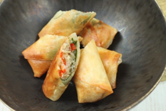 - 春巻きの皮に青じそをおき③を包み、180度に温めた油でからりと揚げて出来上がり。