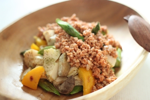 2. フライパンにオリーブ油をひき、玉ねぎ、なすを炒め、ハーブソルト、料理酒、アンチョビペーストを加えて炒め合わせる。