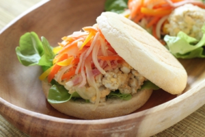 ⑤ マフィンにサラダ菜、卵サラダ(②)、野菜炒め(➂)をのせ、残りのマフィンではさんでいただく。