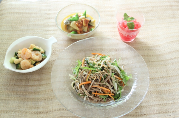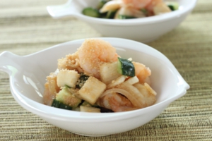 1. きゅうり、長いもは角切りにし、えびはボイルする。
