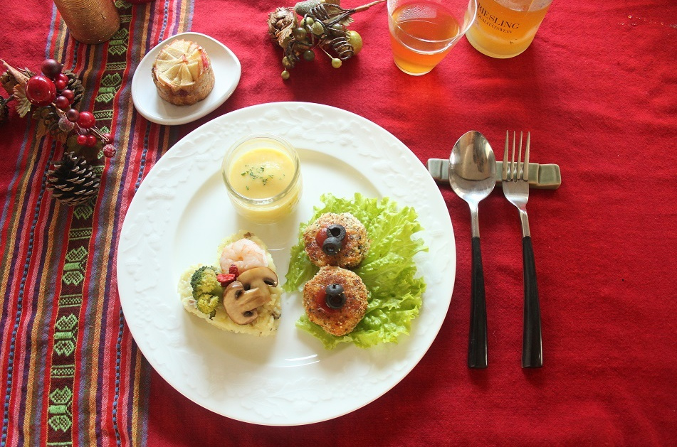 - 器にもり、(あれば型でぬき)、付け合わせの野菜を添える。