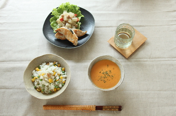 - ボウルに炊き上がったごはん、コーン、豆を合わせ、①、塩、胡椒を加えて混ぜ合わせて出来上がり。