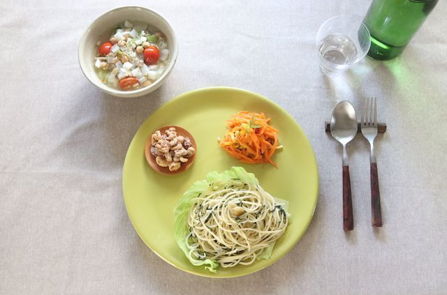 - ゆであがったパスタに青じそと③を加えて、ハーブソルトで味付けをして出来上がり。