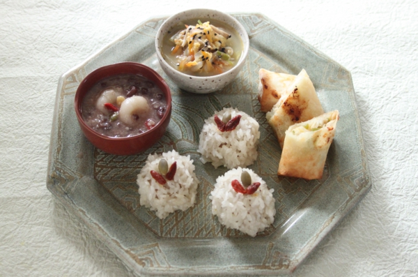 - 蒸気のたって蒸し器で20分程度蒸して出来上がり。(飾りはくこの実など)