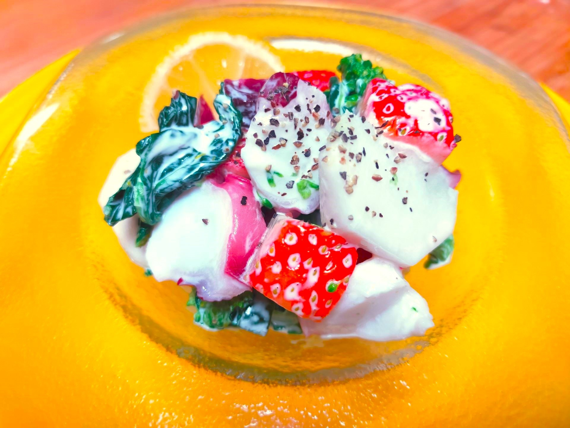 2.いちごは4等分、小蕪は皮を剥き16等分、きゅうりは5mm幅の輪切りにし塩をふって揉んでおく。