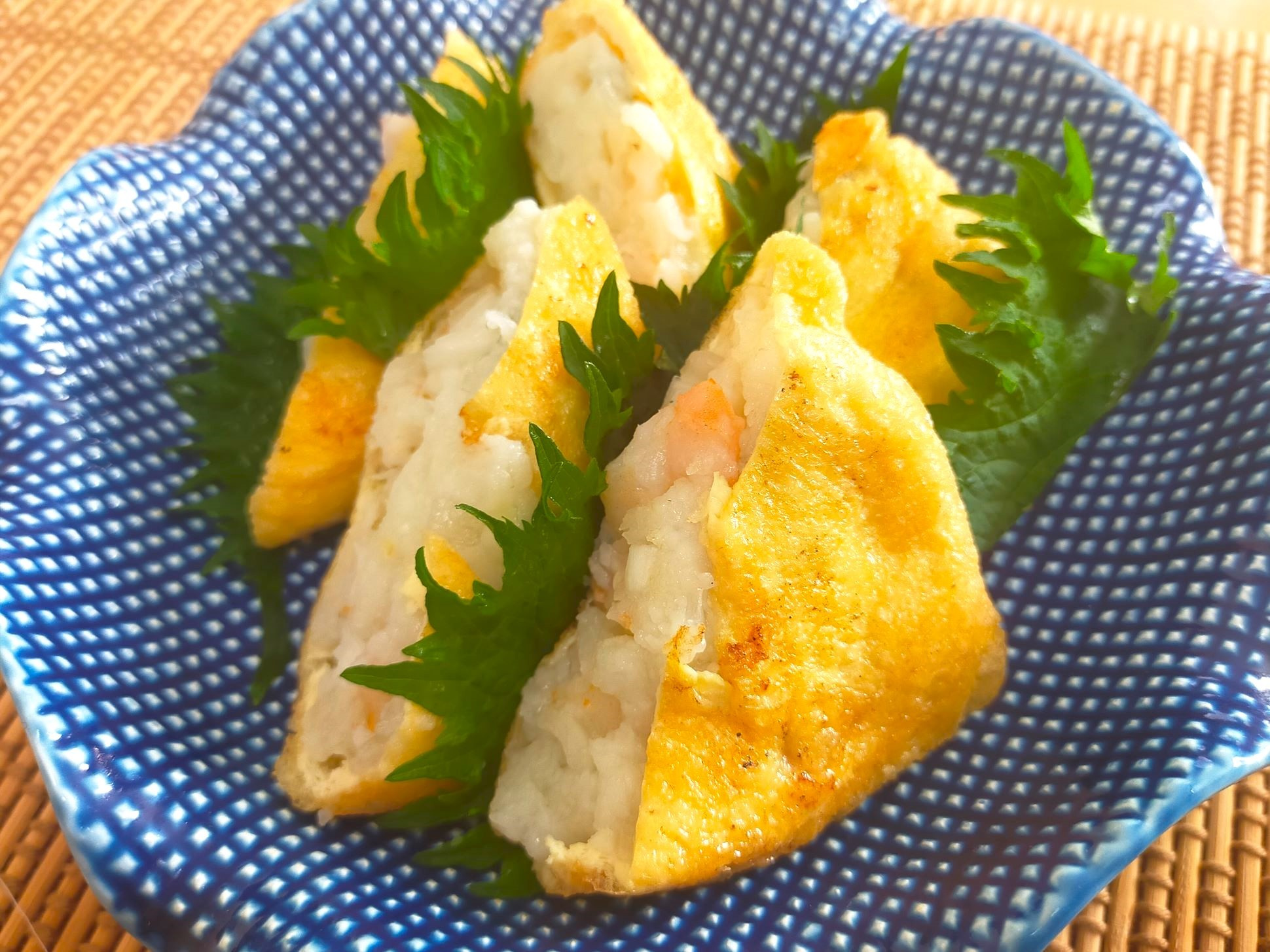 1.エビ(背わたをとり)は粗微塵切りにし、玉ねぎも微塵切り、紫蘇はせん切りにする。薄揚げは油抜きをし袋状にする。