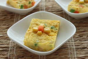 - 卵を割りほぐし、ミックスベジタブル、パルミジャノ、ハーブソルトを加えて混ぜ合わせる。