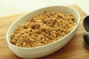 - 耐熱皿に油を薄くぬり(分量外)りんごをひき、④のクランブルをかけて180度に温めたオーブンで15分程度、焼き色がつくまで焼く。