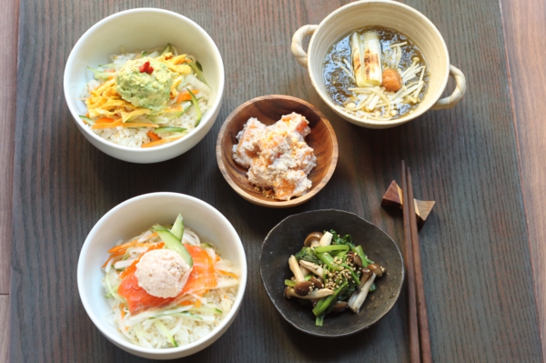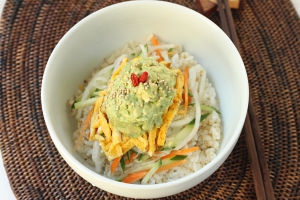 - すし飯に野菜ナムル、卵、アボカドを盛り付けて出来上がり。