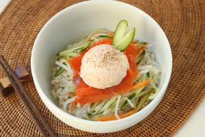 - すし飯、野菜ナムル、スモークサーモン、1をのせて出来上がり。