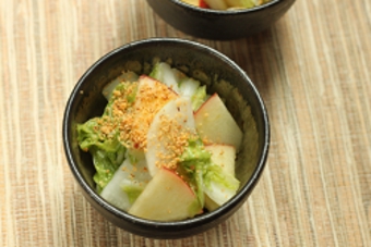 - 白菜は食べやすい大きさに切り、りんご、大根はいちょう切りにする。