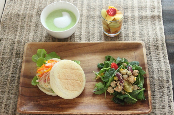 ⑤ マフィンにサラダ菜、卵サラダ(②)、野菜炒め(➂)をのせ、残りのマフィンではさんでいただく。