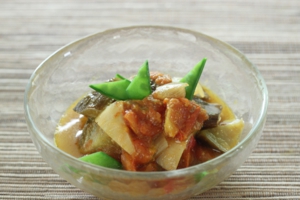 3. 蓋をして野菜に火が通るまで煮る。ゆでたきぬさやを加えて出来上がり。