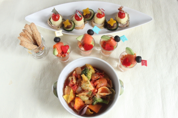 - ズッキーニは輪切りにし、パプリカは型抜きをする。(パプリカの余った部分はみじん切りにしてサーモンのオーディブルに使用する。もしくは別のお料理に使用する)。ミニトマトはへたをとる。
