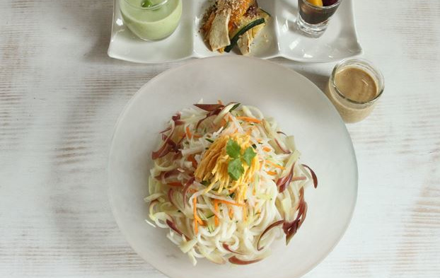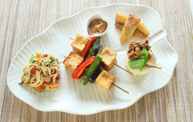 4月のプレートパッタイ/菜の花とパプリカのチーズ和え/鶏と野菜のつくね/アボカドスープ |