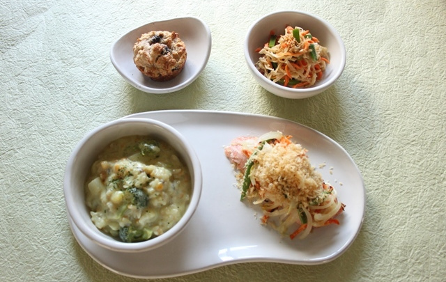 2月のプレートごぼうと里芋の洋風炊き込みごはん/蒸し野菜と生ハムのゴイクン/カリフラワーのホットサラダ/ホワイトチョコのケーキ |