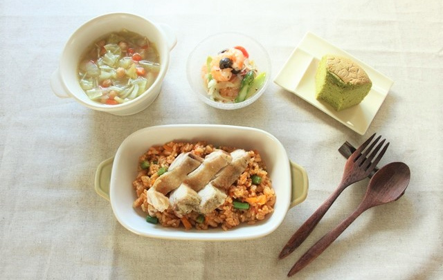 10月のプレートえびのサフラン炊き込みごはん/ガンボスープ/ひよこ豆と彩野菜のマリネ/マスカルポーネのチーズケーキ |