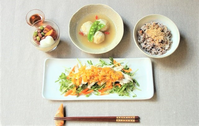 6月のプレートガーリックサラダごはん / 人参とトマトのスープ / チキンの梅風味ソテー / お豆と大根のサラダ |